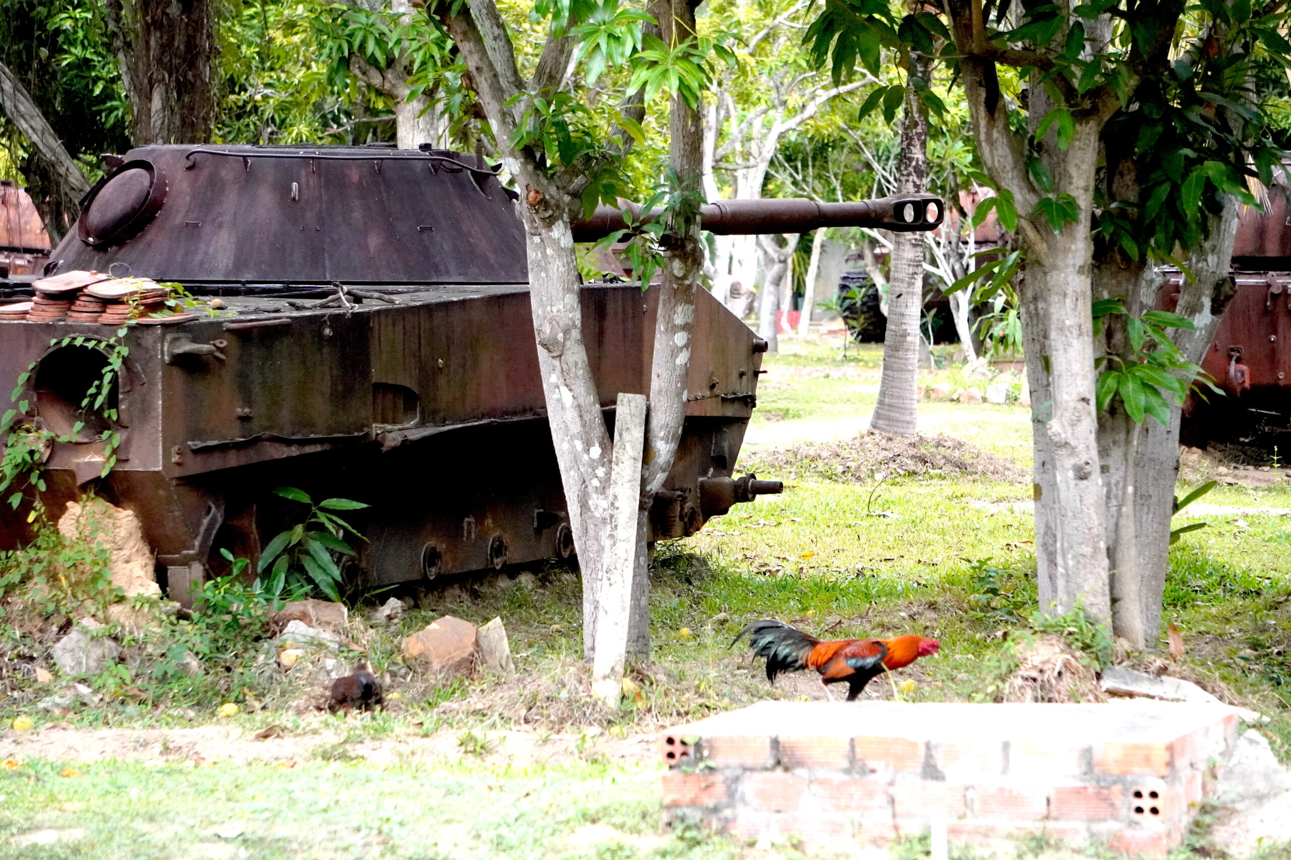<戦車には草木が生え、近所で飼われていると思われる鶏が/「過去と現在」「戦争と平和」が共存しています>
